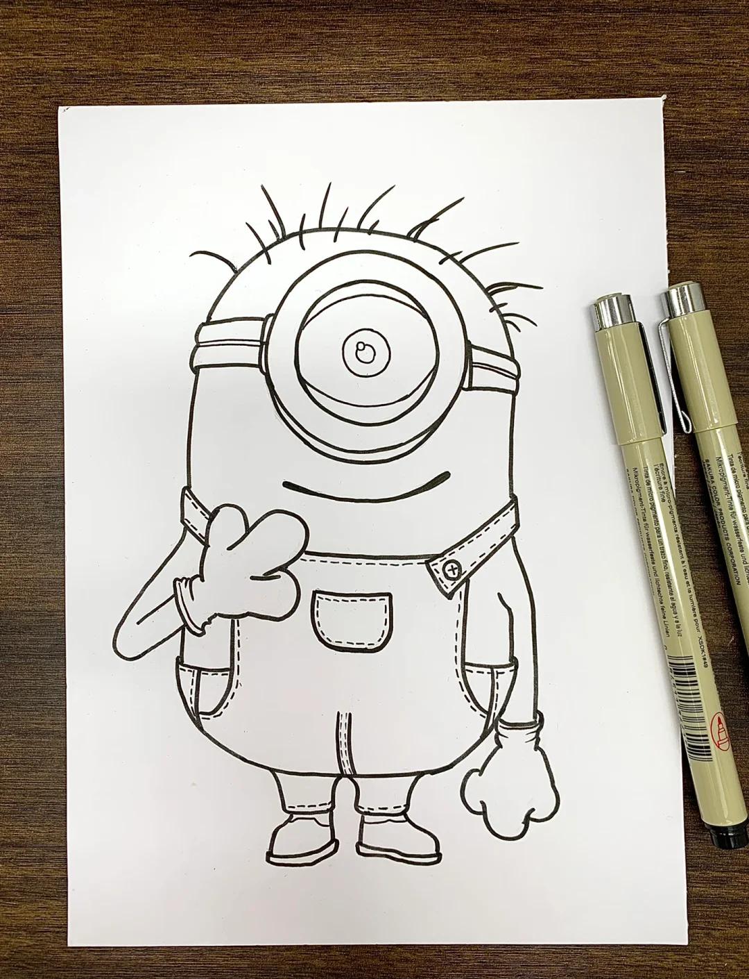 2、第1步2B铅笔起形,根据上图中间的那位小黄人,画出在纸上的轮廓第2步在外轮的基础上,画出小黄人的细节,圆圆的眼睛背带裤的形状胳膊的动态和小脚丫第3步进一步画眼睛,用铅笔勾出眼睛的边缘,画出眼袋和眼球,把眼睛带涂黑第4步这一步画背带裤和小短腿,先画出背带裤的条纹细。