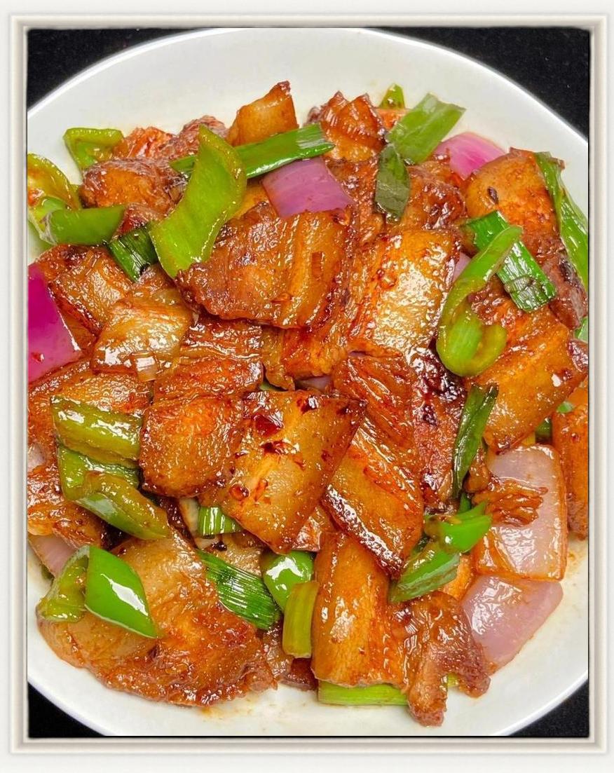 7、回锅肉是一道色香味俱全的下饭菜,更是被称为川菜之首家常回锅肉五花肉半斤,尖椒一个青蒜45根,白糖2茶勺生抽1汤勺,盐2克。