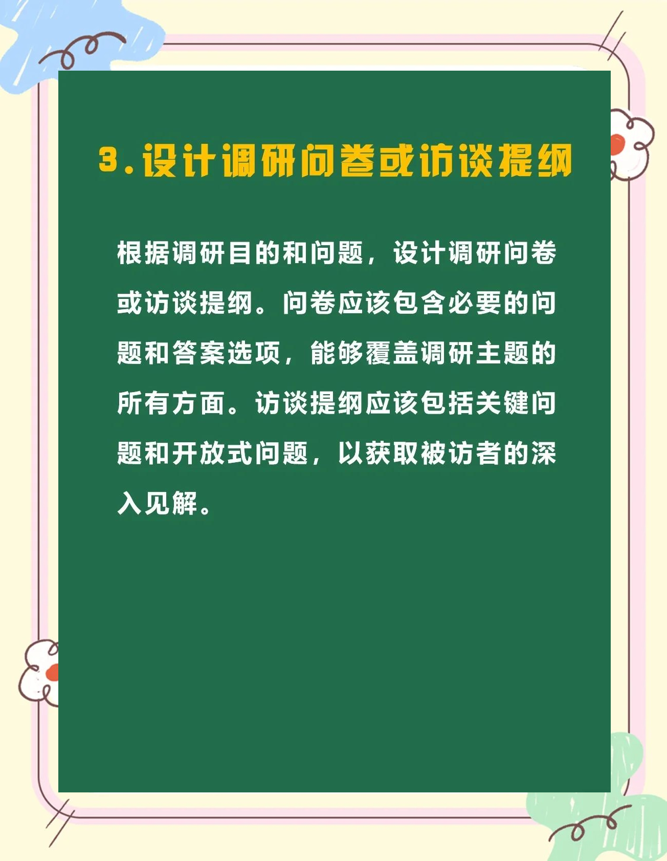 4、市场调研的步骤如下,方法主要包括步骤明确调查目的在市场调研的第一步就需要明确调查目的以及要验证的方向,确保后续的信息收集和验证有明确的范围限制,提升信息的有效性初步了解和分析对项目背景情况及相关行业进行初步了解和分析,平衡调研时间数据可得性对公司价值调研投入成本,确定是否。