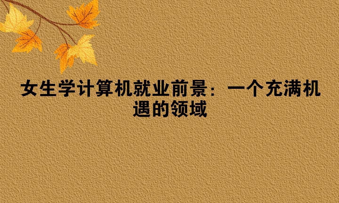 5 科学研究与教育在计算机科学与技术领域,从事科学研究教学和应用开发这个方向要求深厚的理论基础和实践能力,适合对技术有热情的女性计算机专业是一门理论与实践并重发展迅速的学科它强调数学逻辑数据结构算法电子设计计算机架构和系统软件等方面的基础知识,并在此基础上提供多样化的;女生学计算机好就业,且有出路以下是具体分析市场需求大现在是互联网信息时代,市场对计算机网络技术专业人才有一定需求量这意味着女生学习计算机后,在就业市场上拥有广泛的机会性别无差别对待招聘单位对计算机网络技术岗位并没有性别的区分和差别对待,无论是男生还是女生都是一视同仁的因此。