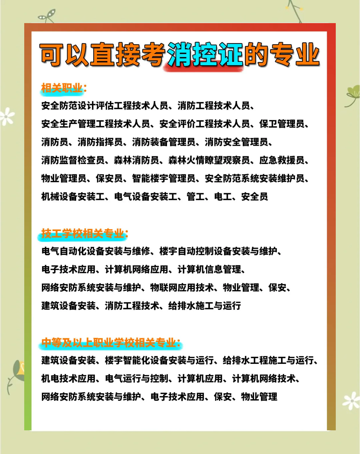 8、二级消防证报考条件要求包括中专及以上学历和相应的工作经验,考试难度相对适中报考条件要求中专学历取得消防工程专业中专学历,需要从事消防安全技术工作满3年若取得消防工程相关专业中专学历,则需从事消防安全技术工作满4年大专学历取得消防工程专业大学专科学历,需要从事消防安全技术工作满2年若。