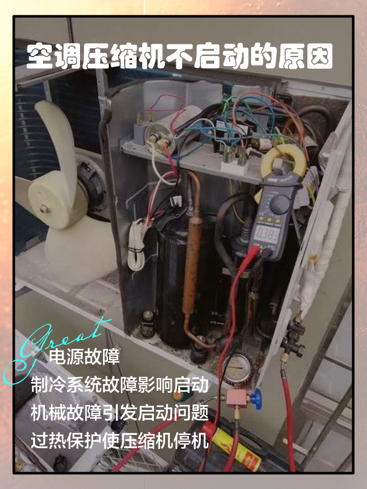 3、2 启动电容损坏电容老化或击穿会导致压缩机无法获得足够启动电流,表现为外机风扇转但压缩机不工作3 外机环境异常散热器积灰过多或外机安装位置通风不良会导致压缩机过热保护,需定期清理外机周围杂物并保持散热片清洁日常使用中,压缩机会因除霜模式或防冻保护周期性停机,此时显示屏可能出现“。