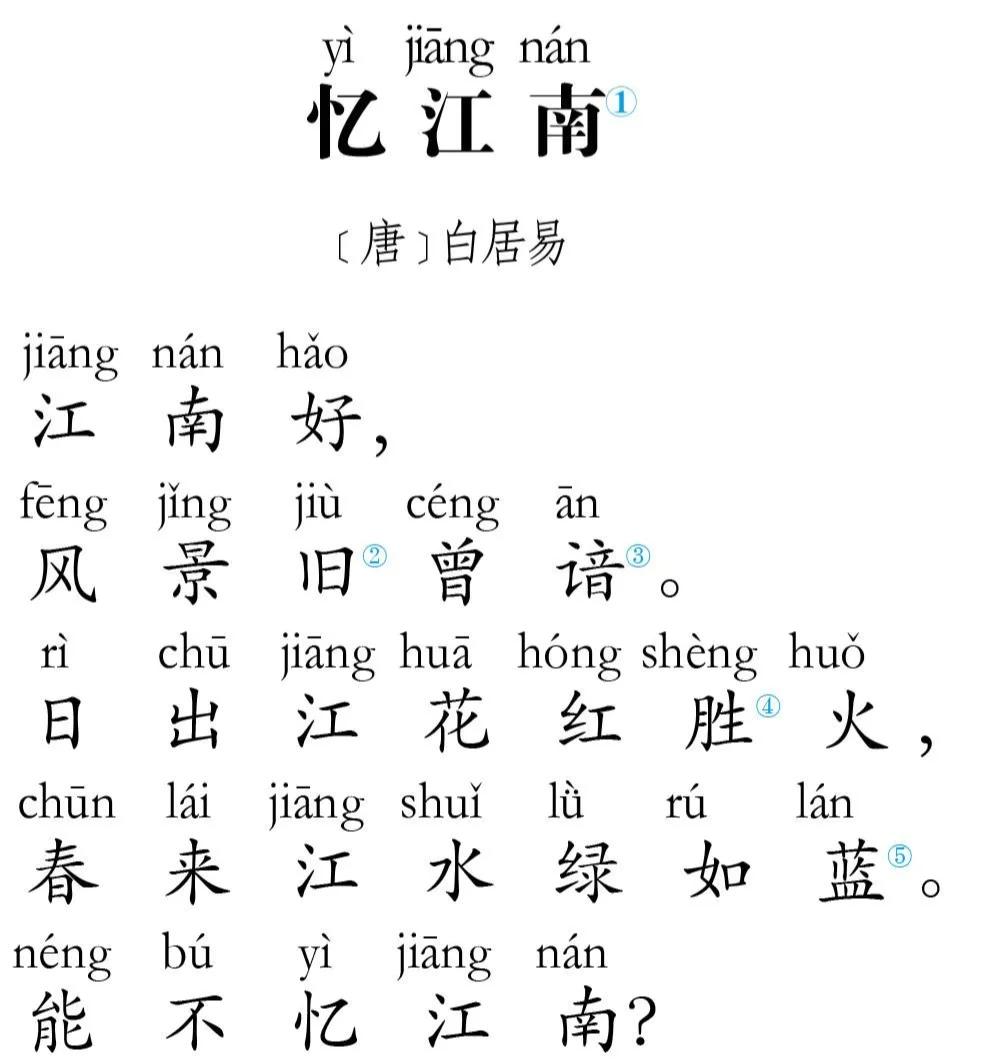 江南好,风景旧曾谙日出江花红胜火,春来江水绿如蓝能不忆江南译文江南好,我对江南的美丽风景曾经是多么的熟悉春天的时候,晨光映照的岸边红花,比熊熊的火焰还要红,碧绿的江水绿得胜过蓝草怎能叫人不怀念江南注释忆江南唐教坊曲名作者题下自注说“此曲亦名‘谢秋娘’,每首五。