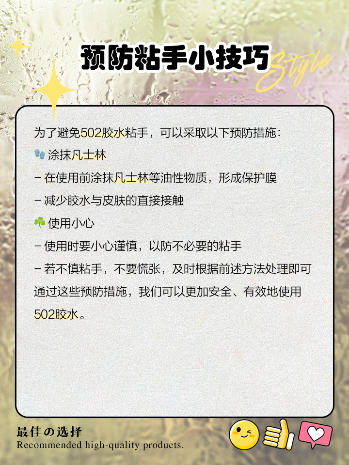 3、502胶水粘在手上怎么去除 1热水浸泡 我要将手浸泡在热水中,等待一段时间,这个时间可以控制在20到30分钟之间,直到胶水软化然后,我们就可以使用磨砂纸或指甲钳等工具,轻轻去除胶水 2风油精 我们可以将风油精涂抹在胶水上,等待几分钟,然后用纸巾或棉签擦拭干净我们在进行操作的时候不要将风油精弄到眼睛中去,这就得不偿失了。