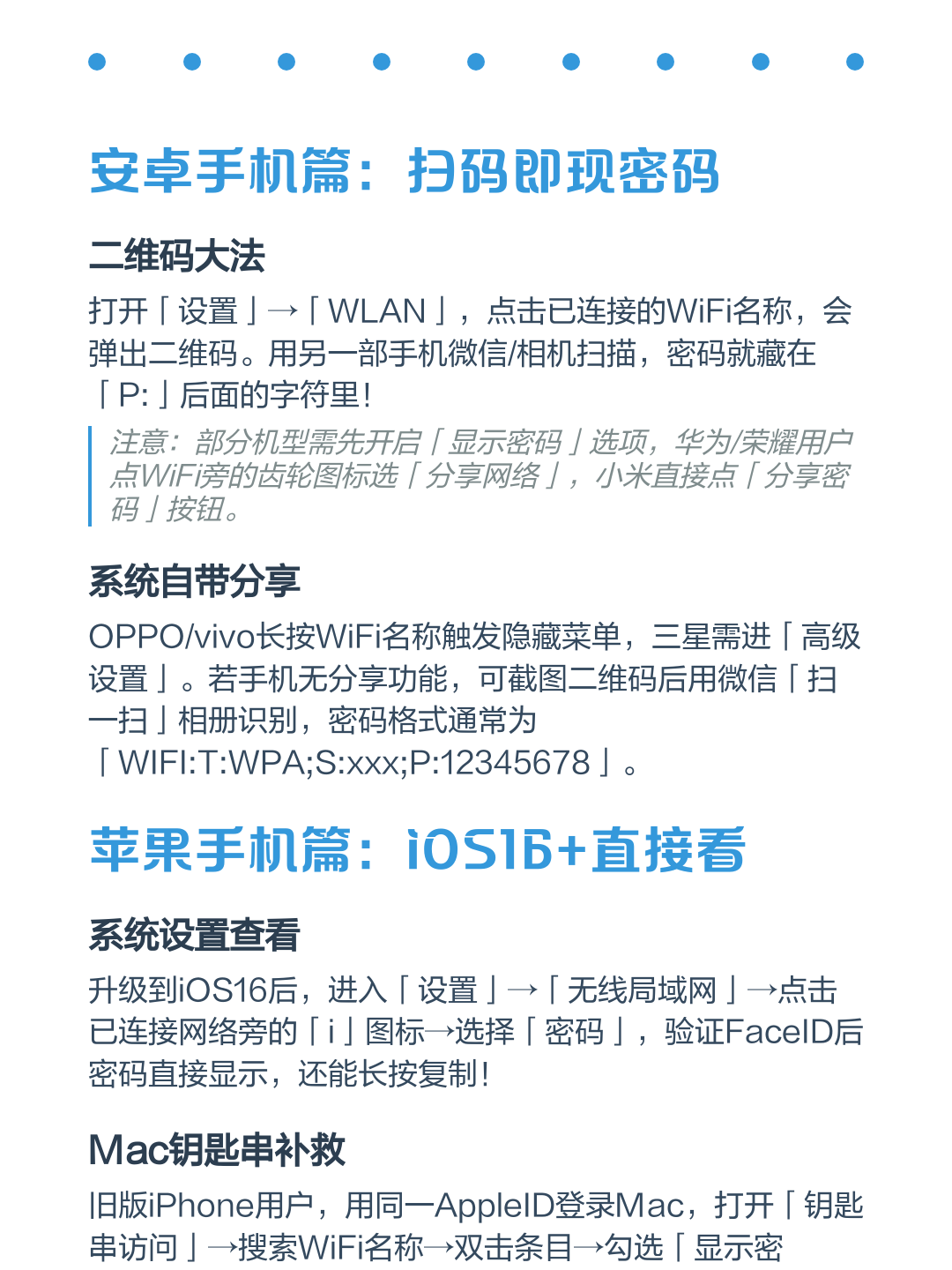要查看安卓手机上的WiFi密码,可以通过以下几种方法1 **使用系统分享功能** 打开手机的“设置”应用,进入“WLAN”或“网络和互联网”选项 在已连接的WiFi列表中,找到并点击目标WiFi网络 部分手机在WiFi详情页面会提供“分享密码”或“二维码分享”功能点击后,手机将生成一个包含WiFi。