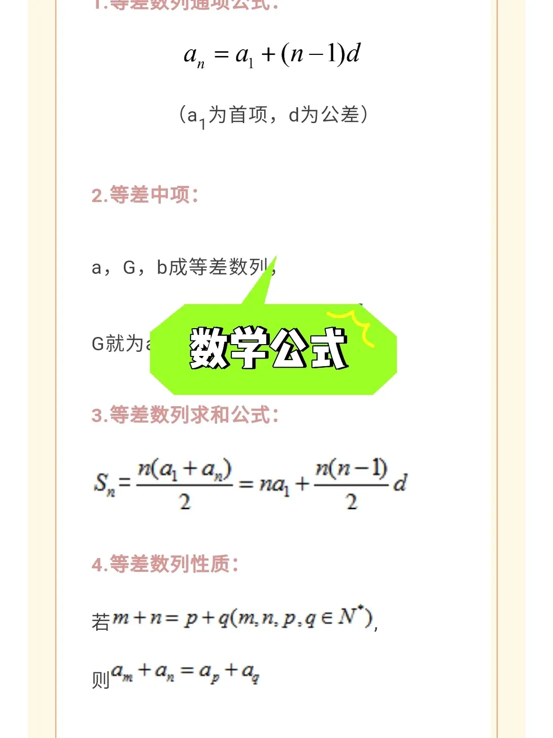 2、等差数列的通项公式为an=a1+n1*d前n项和公式为Sn=a1*n+n*n1*d2或Sn=n*a1+an2这里的n指的是项数,有几项就取几;基本思路等差数列中涉及五个量a1,an,d,n, sn,通项公式中涉及四个量,如果己知其中三个,就可求出第四个求和公式中涉及四个量,如果己知其中三个,就可以求这第四个等差数列基本性质 1数列为等差数列的重要条件是数列的前n项和S 可以写成S =+的形式其中ab为常数;等差数列的前n项和公式为S_n = fracn2 times 其中 $S_n$ 代表前n项的和 $a_1$ 是首项 $a_n$ 是第n项 $n$ 是项数这个公式用于计算等差数列在一定区间内的所有数值之和,它基于等差数列的性质,即每一项与它的前一项的差是一定的,通过数学推导得出在实际应用中;等差数列的前n项和公式为$S_n = fracn2 times $,或者等差数列前n项和也可以表示为$S_n = fracn2 times 2a_1 + d$,其中d为公差S_n$代表前n项的和$a_1$代表首项$a_n$代表第n项n代表项数d代表公差,即等差数列中任意两项的差这个公式。