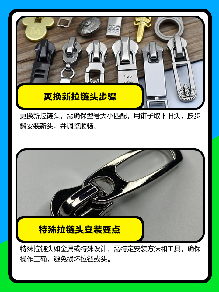 拉链头掉了装回去方法使用拆线器拆掉拉链末端的缝合线,两边的都要拆,然后使用尖嘴钳将金属合片打开取下把拉链上的滑块从拉链上取下来,如果取不下来的话,可以用钳子把它打开但这样很有可能把齿或者拉链搞坏然后小心地把新滑块安上在把滑块拉上去之前,先要使拉链进入滑块的上方开口,然后;拉链头掉了,可以按照以下步骤将其装回去一准备工作 首先,准备一个打火机使用打火机轻轻烧一下脱落的那头布面,这一步的目的是为了防止布边脱线,确保拉链头能够顺利安装并保持稳定二安装拉链头 将拉链水平朝上放置在桌面上,确保拉齿间朝上把拉链头拉进齿中,此时需要双手捏住布带两端。