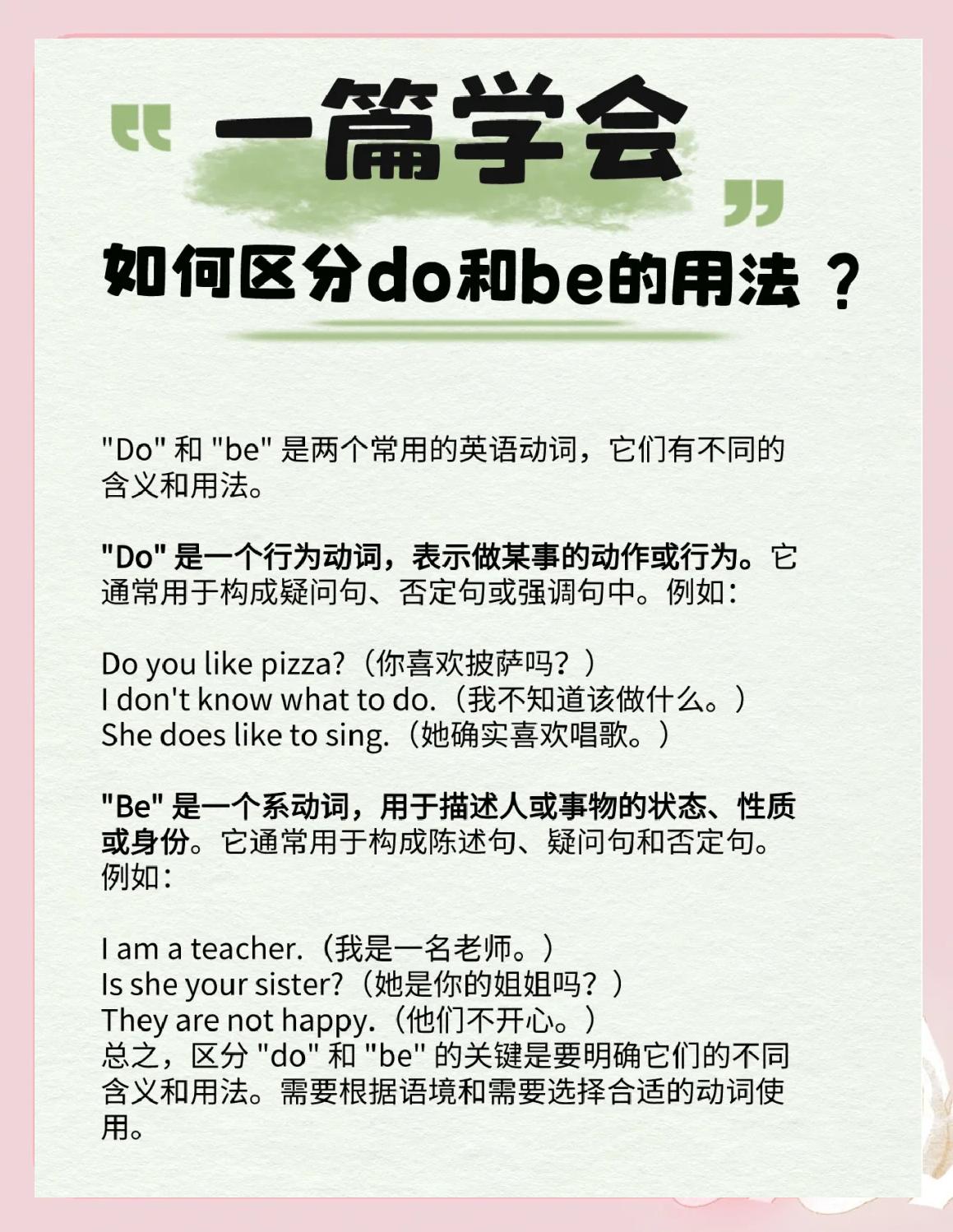 do和does的区别和用法如下一作为实义动词的区别和用法 意义do和does作为实义动词时,都表示“做”的意思用法do用于第一人称I和第三人称复数youwethey的主语后例如“We usually do our homework in the afternoon”我们通常下午做作业而does则专门用于第三人称单数;does和do的疑问句口诀如下Does的疑问句口诀 “Does加s,主语不变,疑问句就完成”当主语为第三人称单数时,在句子开头加上does,主语保持不变,即可构成疑问句例如,“Does he like pizza?”Do的疑问句口诀 “Do不加s,主语不变,疑问句就不难”当主语为第一人称第二人称或;顺口溜 do,does来帮忙,单数第三人称does上场 其余人称都用do,疑问否定也不慌 动词原形跟后面,疑问词放最前方解释作为实义动词do表示“做”的意思,用于第一人称第二人称以及第三人称复数的主语后does同样表示“做”的意思,但专门用于第三人称单数的主语后作为助动词do。