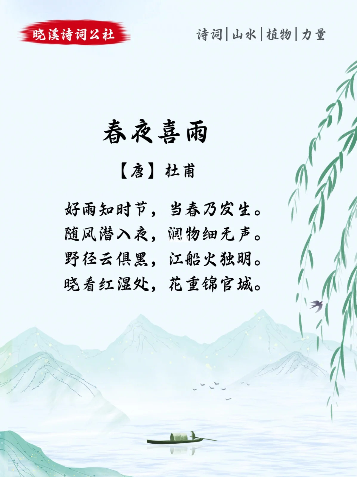 释义好雨知道下雨的节气,正是在春天植物萌发生长的时侯随着春风在夜里悄悄落下,无声的滋润着春天万物雨夜中田间小路黑茫茫一片,只有江船上的灯火独自闪烁天刚亮时看着那雨水润湿的花丛,娇美红艳,整个锦官城变成了繁花盛开的世界春夜喜雨唐代杜甫 好雨知时节,当春乃发生随风潜入。