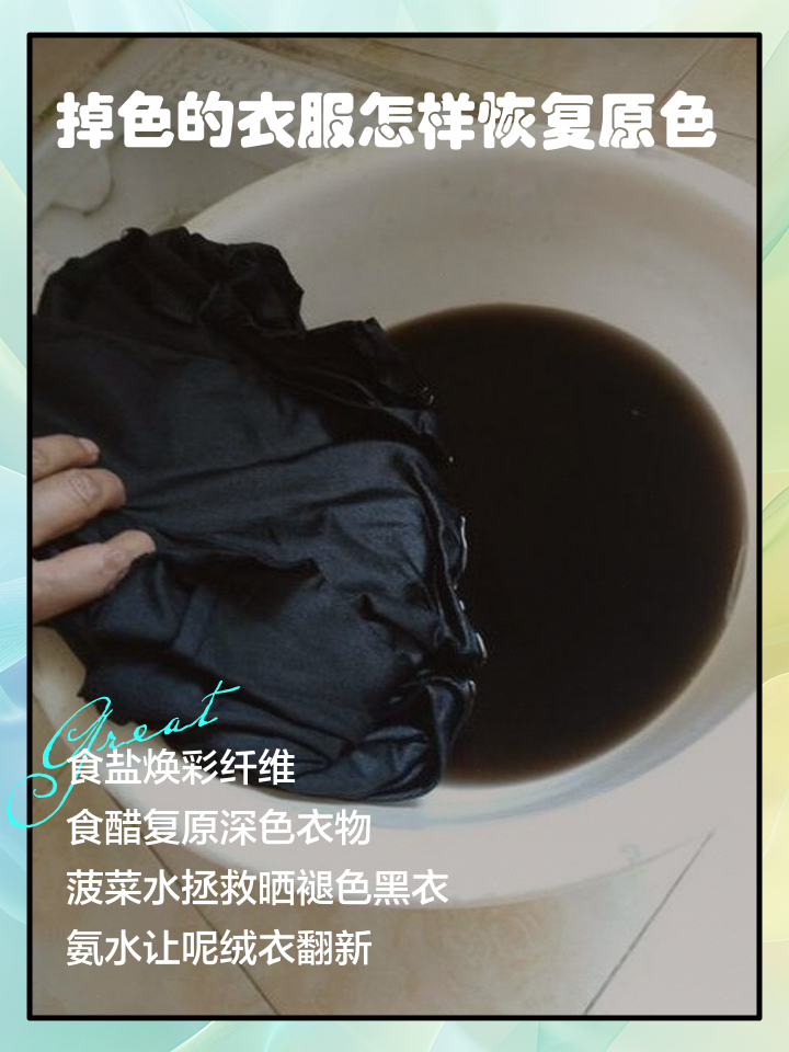 可尝试以下方法让发红的黑衣服恢复黑色食醋法把食醋滴入清水中,将发红的黑衣服放入食醋水盆浸泡一会,之后搓洗晾干,可有效去红啤酒墨水法取半盆水,倒入半瓶啤酒和少许蓝黑色墨水,搅拌均匀后放入褪色衣服,浸泡半小时取出洗净菠菜水法把黑色衣服浸泡在菠菜煮过的水中,衣服可能会变回黑色。