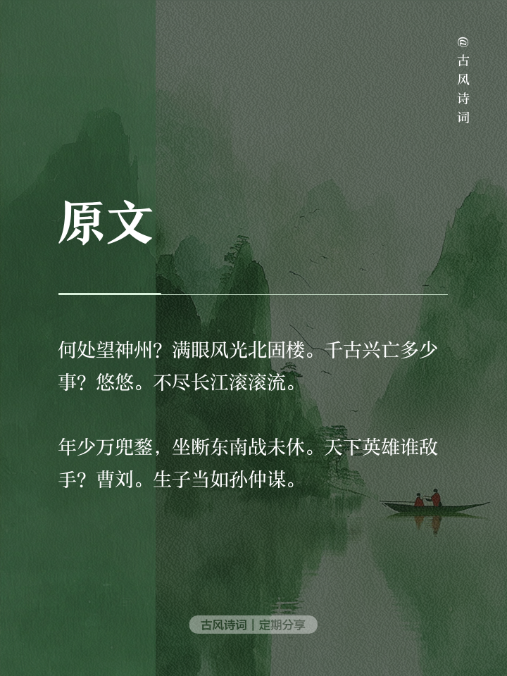 1南乡子·登京口北固亭有怀何处望神州满眼风光北固楼千古兴亡多少事悠悠不尽长江滚滚流年少万兜鍪,坐断东南战未休天下英雄谁敌手曹刘生子当如孙仲谋2译文 从哪里可以眺望故土中原眼前却只见北固楼一带的壮丽江山,千百年的盛衰兴亡,不知经历了多少变幻,真是说不清。