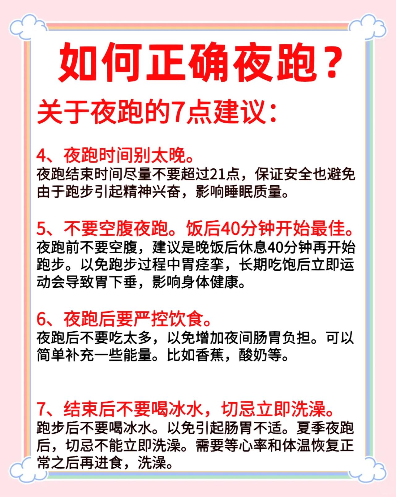 一最佳时间分析 饭后1小时夜跑应选择饭后1个小时以后进行,以避免运动时震动胃肠,引起腹痛通常人们晚上78点吃饭,因此9点左右是较为合适的时间晚上10点前晚上10点以后是身体的休息时间,不适合运动,因此夜跑应在晚上10点之前结束二夜跑的好处 减肥效果好跑步运动是最健康的减肥方式。