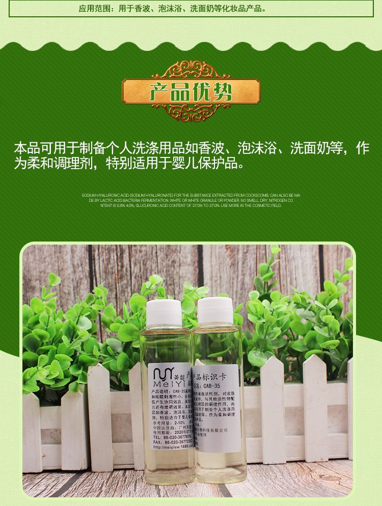10、CAB35是一种两性离子表面活性剂,是椰油酰胺丙基甜菜碱的一种椰油酰胺丙基甜菜碱是以以椰子油为原料,通过与NN二甲基丙二胺的缩合生成PKO再和氯乙酸钠一氯乙酸与碳酸钠制得季铵化两步反应而制成具有良好的清洗起泡调理作用,与阴离子阳离子和非离子表面活性剂相容性好椰油酰胺。
