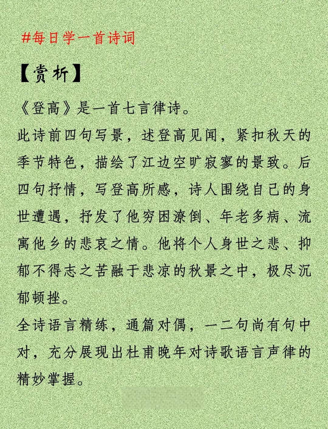无边落木萧萧下,不尽长江滚滚来 万里悲秋常作客,百年多病独登台 艰难苦恨繁霜鬓,潦倒新停浊酒杯 二译文 风急天高猿猴啼叫显得十分悲哀,水清沙白的河洲上有鸟儿在盘旋无边无际的树木萧萧地飘下落叶,长江滚滚涌来奔腾不息悲对秋景感慨万里漂泊常年为客,一生当中疾病缠身今日独上高台历尽了艰难苦。